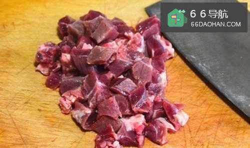 4去除血水的牛肉切成2cm左右的牛肉粒牛肉粒放入小碗中加入少量食盐,胡椒粉和料酒抓匀后,再加入淀粉抓匀,腌制20分钟;