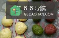 5两种颜色的油酥分别混合成团,能捏到一起就行。
