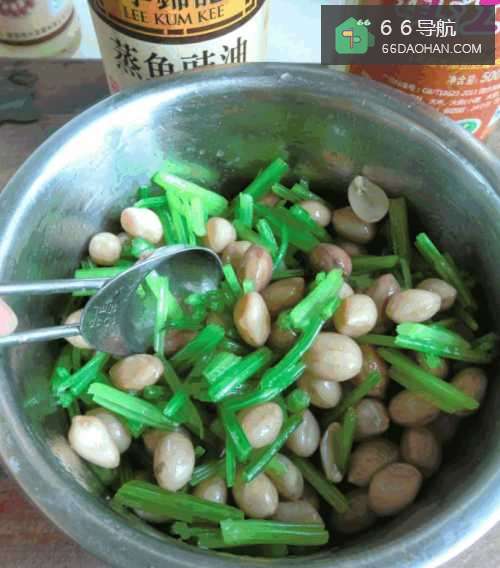 4把花生米芹菜放入碗中加入白糖,蒸鱼豉油,香醋。
