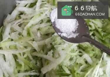 3在擦成丝的萝卜上撒少量的盐,搅拌均匀,放置20分钟左右,目的是用盐滤出萝卜中的水分
