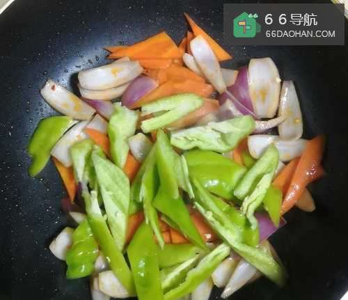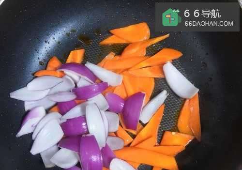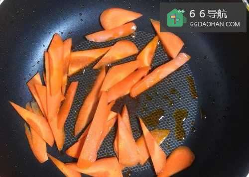 4锅中再淋少许油,油热后放胡萝卜翻炒几下。