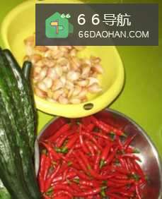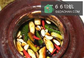 5在腌制容器中,依次加入晾量的酱汤、黄瓜、姜、蒜、辣椒拌匀。