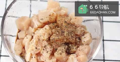3接下来,我们将鸡胸肉切小块,放入适量生抽,料酒,盐和胡椒粉,拌匀,然后腌制10分钟左右。