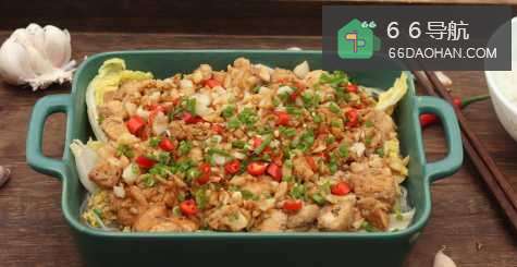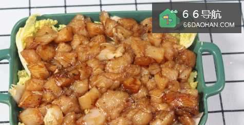 4这时,把腌制好鸡胸肉丁全部铺到娃娃菜上面;