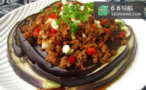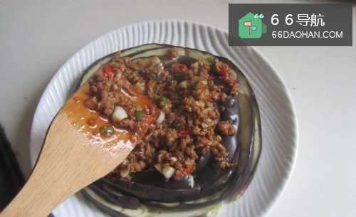 10将煮好的肉末汁淋在摆蒸好的茄子上
