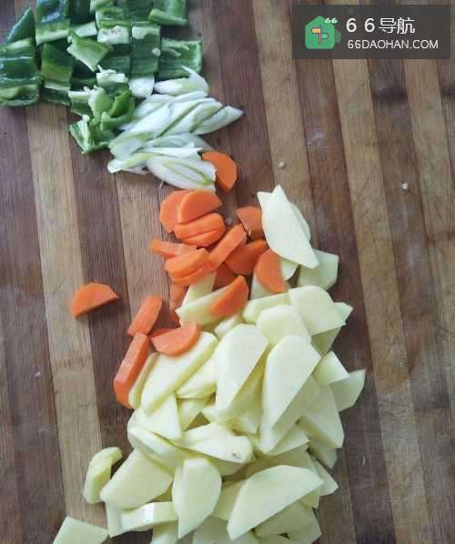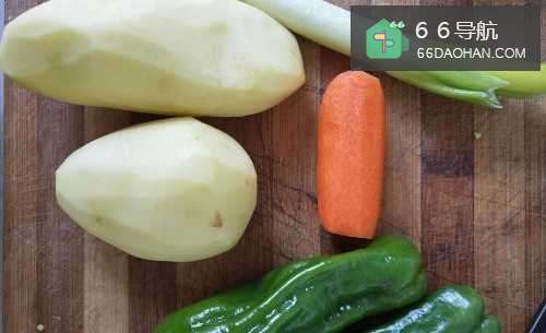 2如图,把土豆、青椒、大葱、胡萝卜切好备用。