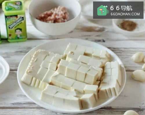2嫩豆腐小心从盒中取出,切成1*1cm左右的方块。