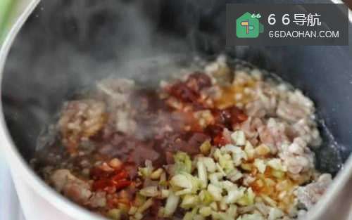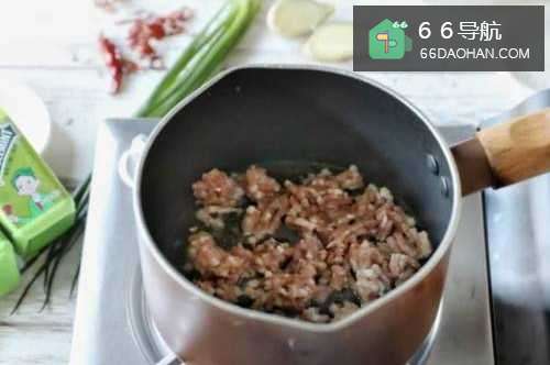 4锅内倒入适量食用油,油热后下肉末翻炒出香味。