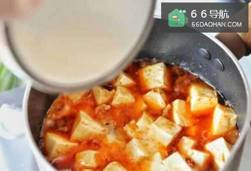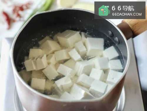 3锅内倒入适量水,开火煮开水,然后改小火下豆腐,另外加一勺盐,煮一分钟,去掉豆腥味。