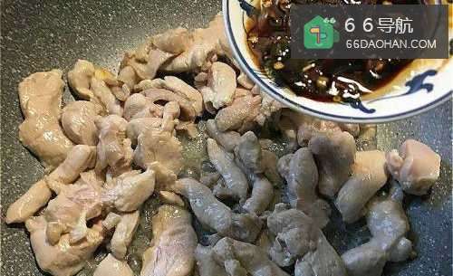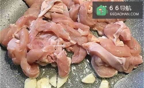 3不沾锅放一大匙油,放入蒜片、鸡胸肉,用中小火炒香蒜片,炒熟鸡胸肉。