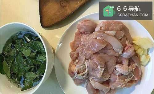2鸡胸肉切块,九层塔洗净,蒜头切片。