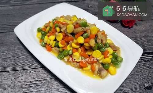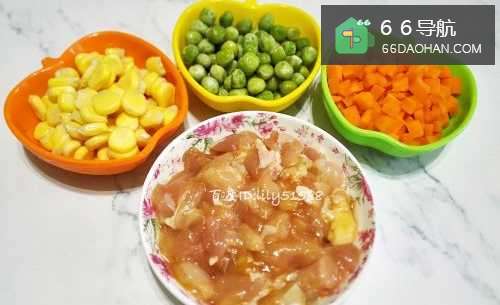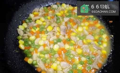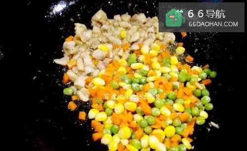 6放入焯过水的玉米粒、豌豆、胡萝卜和鸡腿丁一起翻炒几下。