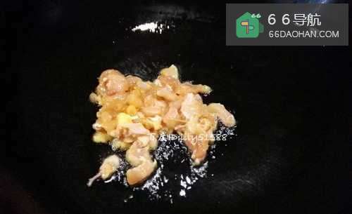 5烧热锅放入油,把腌制好的鸡腿丁放入锅里爆炒1分钟。
