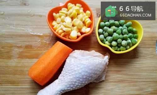 首先要准备食材主料鸡腿1个、胡萝卜半个,豌豆和玉米粒各50克。