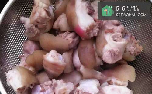 猪脚剁成大块,冷水放入锅中焯烫下,待大火煮开,浮沫煮出来了,将猪脚捞出,用温水冲洗下,控水。