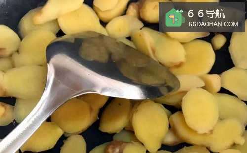 2小黄姜清洗干净,直接切成片,不需要去皮,锅中无需添油,直接放入姜片,小火煸炒一会,慢慢将姜的水分煸出并且蒸发,待看到姜的表面微微焦黄的时候。