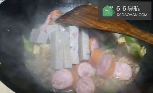 6接着放进去肉糕和香肠,还有咱们准备好的蔬菜。