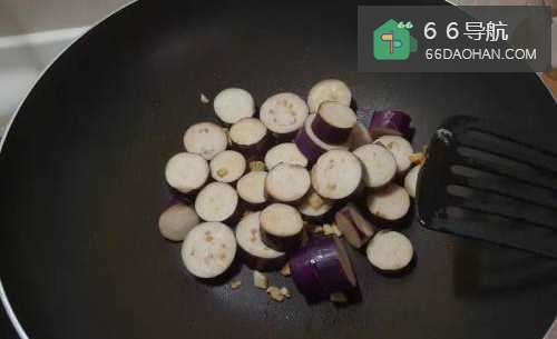 2热锅后倒入少许油,炒香蒜末后,放入茄子拌炒,然后倒入少许水盖上锅盖闷至茄子稍微吸水变软