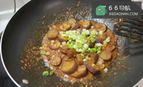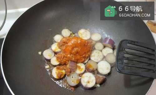 3倒入罐头肉酱,再加入少许水,拌炒后再盖上锅盖闷至茄子变软