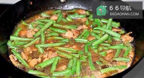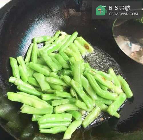 3热锅烧油,将豆角倒入锅中,炒至变色;