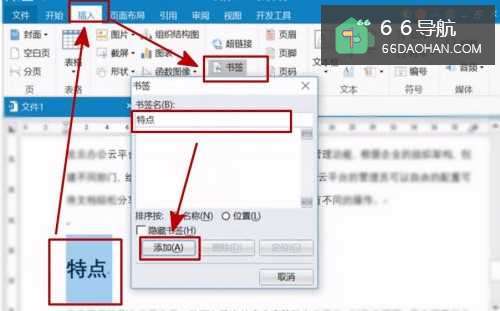 选中需要跳转的文字,点击【插入】,选择【链接】,然后点击选择【书签】,在书签弹出框中,输入书签名,并确定添加