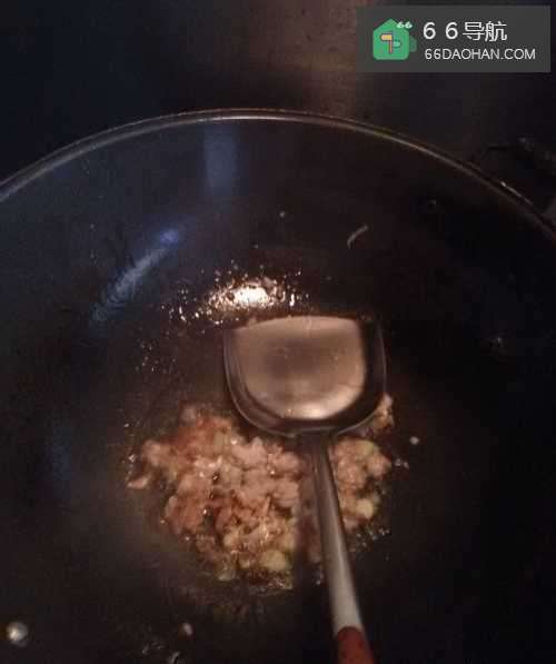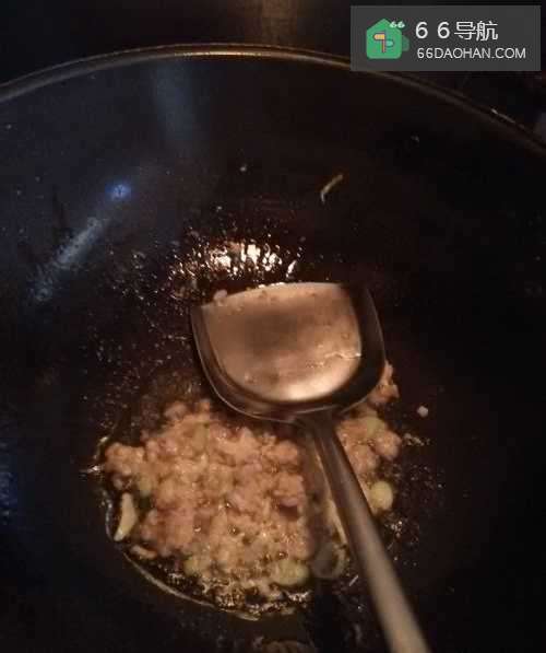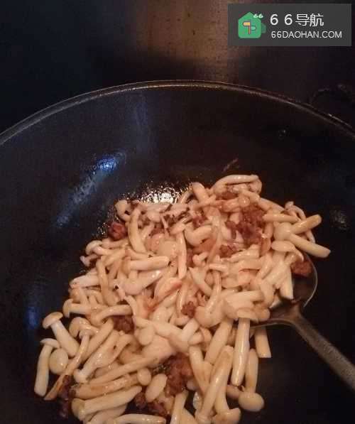 7将白玉菇倒入锅中,和肉末一起翻炒均匀。