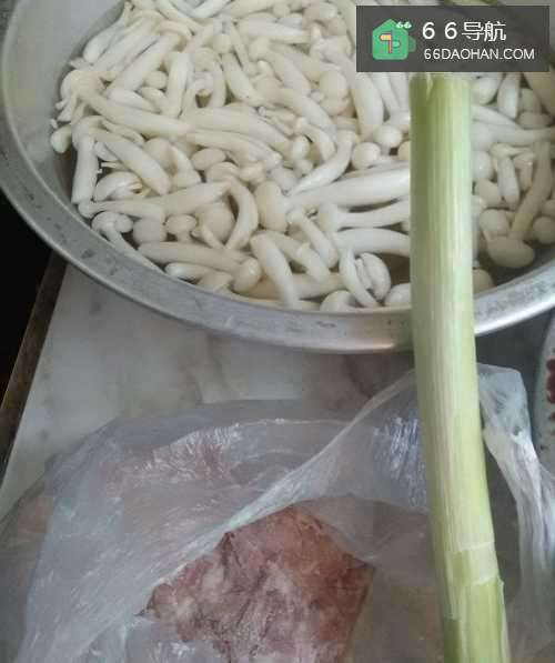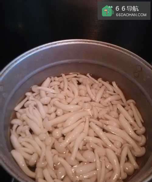 3将白玉菇放入烧开的水中,焯一会儿,去掉白玉菇的草味,然后捞出控干。