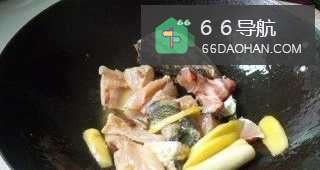 10锅里放油炒香葱姜蒜,下入鱼头鱼尾鱼骨头鱼皮等炒一分钟。
