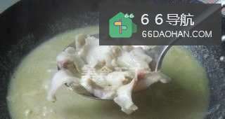 13再用大火烧鱼汤,鱼片一点点放入,晃动锅,最上面的鱼片7成熟捞出放在碗上面。