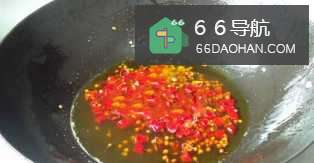 15锅里放油,凉油的时候就放入花椒和辣椒圈,小火烧,注意看辣椒,变得红中微黄且油亮干酥。