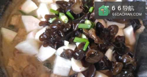 6然后放入备用的萝卜、木耳,顺便再放一次的大葱和生姜,然后加入适量的盐和味精。
