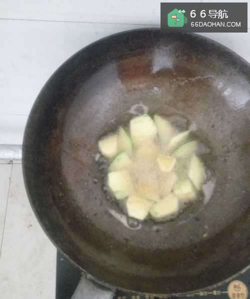 捞出土豆后,倒入茄子,中火炸制,直到茄子变软,颜色发黄时,捞出备用