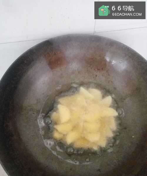 在炒锅中加入食用油,中火加热,待到油中有小气泡冒出时,倒入土豆煎炸,炸至土豆变成金黄色时,捞出备用