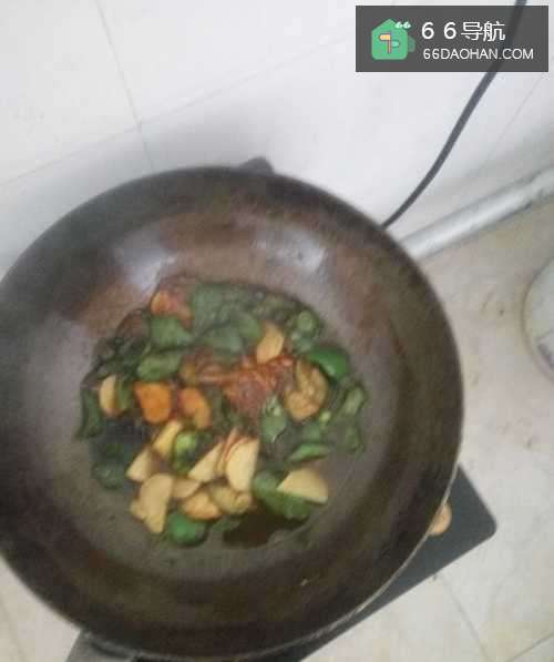 将炸好的土豆和茄子倒入锅中,加入事先调好的酱汁,使之上色,调味,大火翻炒