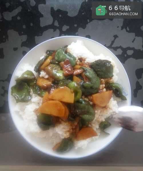将米饭盛到盘子里,浇上带有浓浓汤汁的地三鲜,我们就可以开饭啦