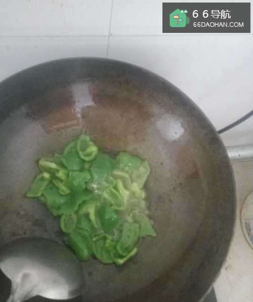 在锅中留少许食用油,倒入青椒,翻炒半分钟