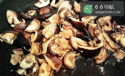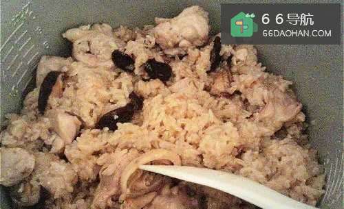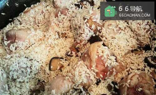 3待炒出香菇香气出来后倒入鸡肉拌炒一下,再倒入糯米一起炒3分钟左右