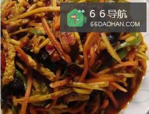 4锅中留底油先煸炒胡萝卜,然后放入豆瓣酱炒出红油,依次放入笋丝、黑木耳、青椒、猪肉翻炒均匀,倒入调好的汁,最后放糖调味,出锅。