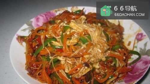 6先加入胡萝卜丝炒至8分熟,然后加入青椒丝翻炒。