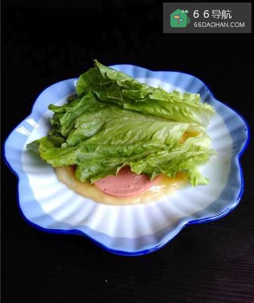 7铺上切片的火腿肠、洗净沥干水分的生菜。