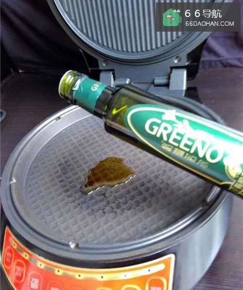 4电饼铛里,倒入适量有机亚麻籽油;用刷子刷均匀,启动“预热”程序;