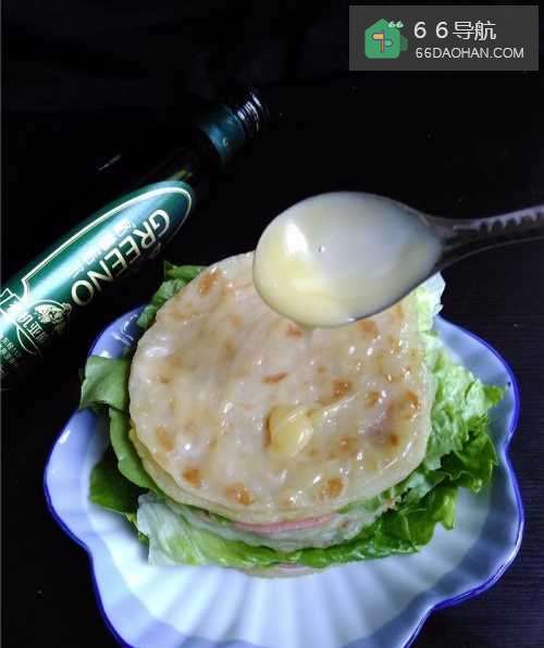 9继续抹沙拉酱,盖火腿肠、生菜,薄饼。