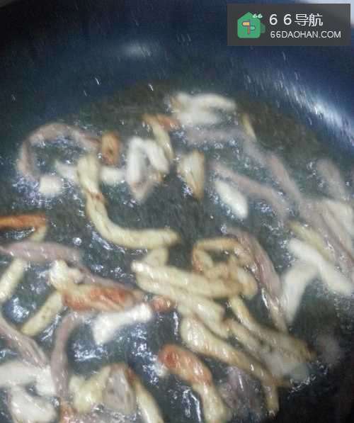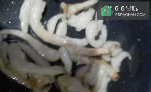 4煸炒好肥肉丝后将瘦肉丝放入锅中翻炒至变色,倒入黄酒烹香