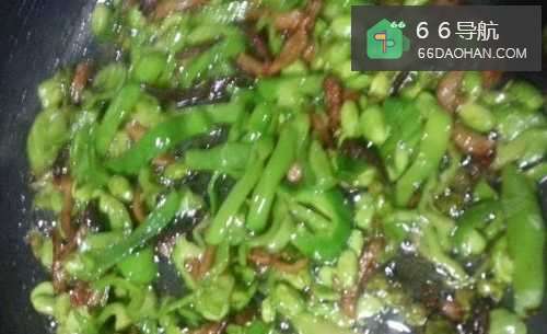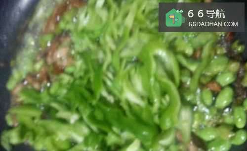 6将青椒丝放入锅中,大火翻炒,炒至青椒断生