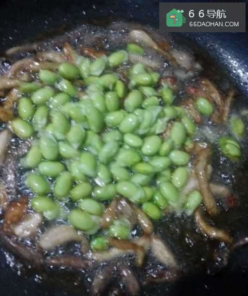 5将毛豆米倒入锅中,中火翻炒,毛豆米炒断生
