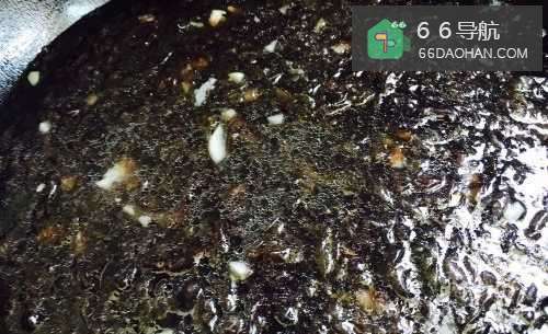 2接着开火,锅烧热之后倒入适量油,油热了加入一点蒜末煸香后把紫菜倒进去翻炒。