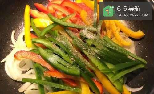 5放入青椒与甜椒,以盐和黑胡椒粉调味