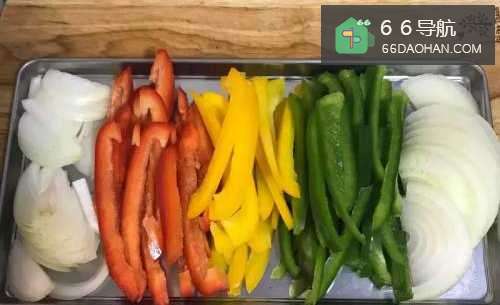 2洋葱去皮切条状,青椒与甜椒去籽去白膜后切条状