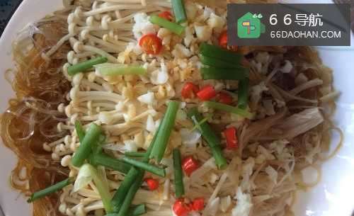 7葱花和指天椒洒在金针菇上,趁热浇上热油,最后放入锅里蒸十分钟,就可以出炉开吃了;
