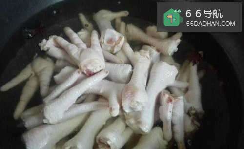 3将鸡爪在沸水中煮7分钟,捞出来后放入凉开水中拔凉、捞出